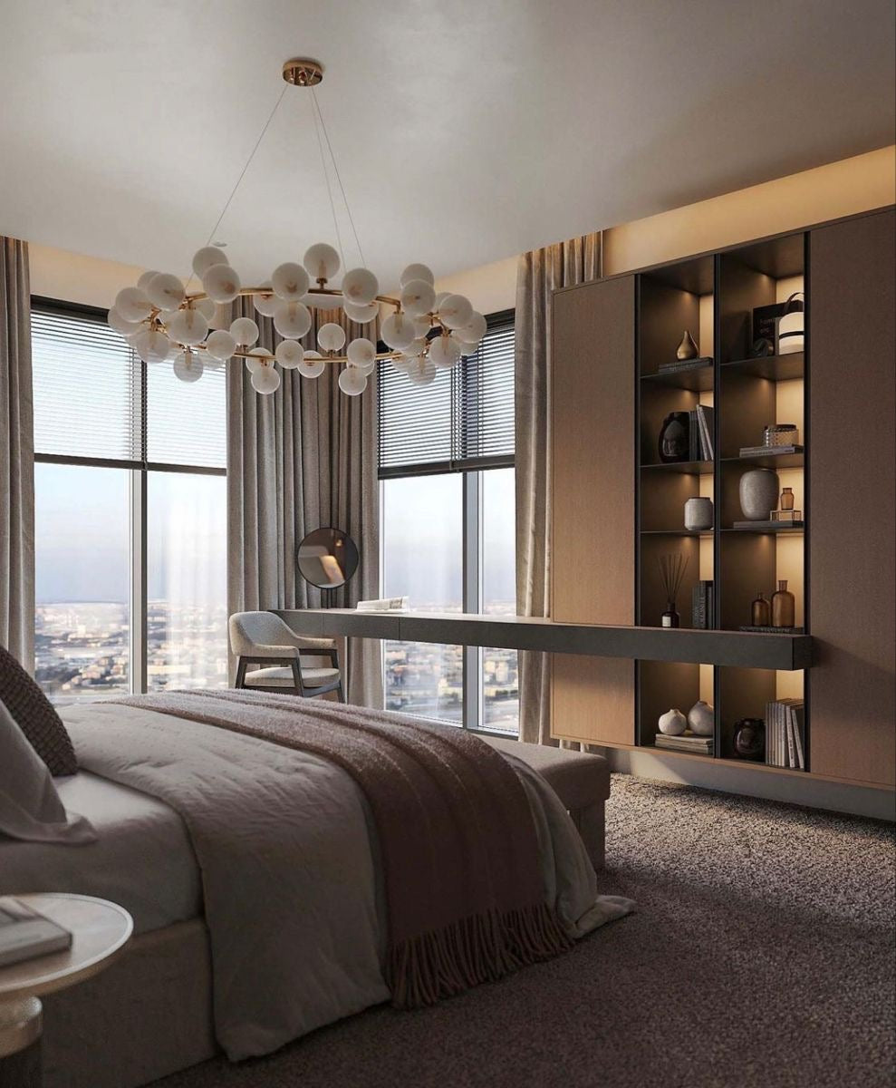 De Halo White Gold is een eigentijdse kroonluchter die direct de aandacht trekt en een indrukwekkend statement maakt. Deze stijlvolle lamp is vervaardigd uit duurzaam messing met een verfijnde satijnen afwerking. De elegante, witte glazen kelken zorgen voor een warme en sfeervolle verlichting, perfect voor elke ruimte.