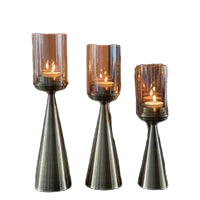Deze stijlvolle, luxe kandelaar is vervaardigd uit hoogwaardig metaal en champagnekleurig glas, afgewerkt met een elegante parelglans. Geschikt voor zowel stompkaarsen als waxinelichthouders. Combineer hem mooi met de M- en L-variant voor een complete set!