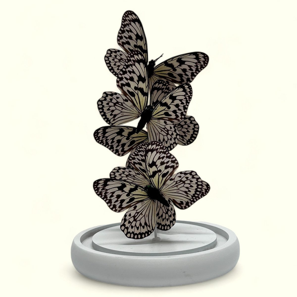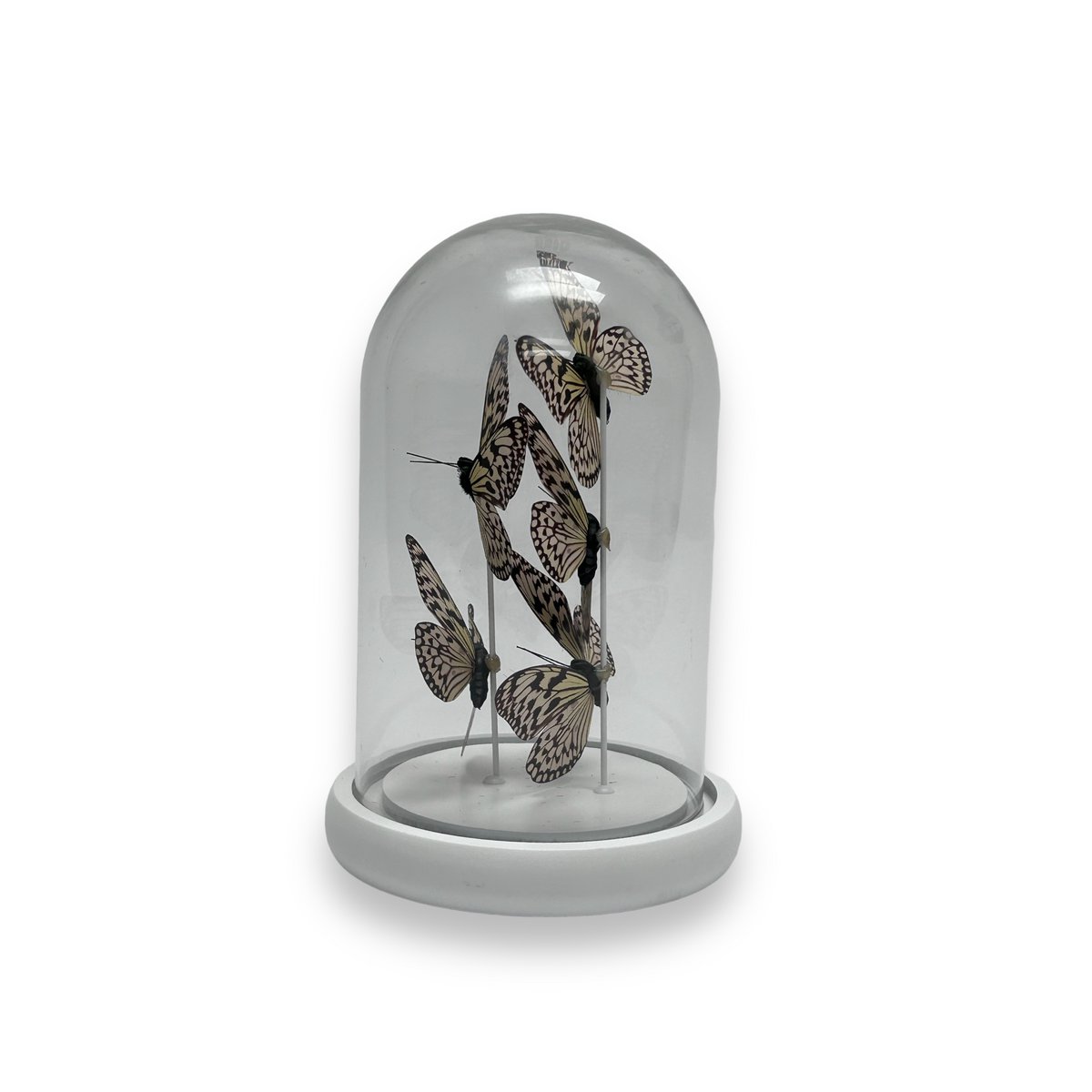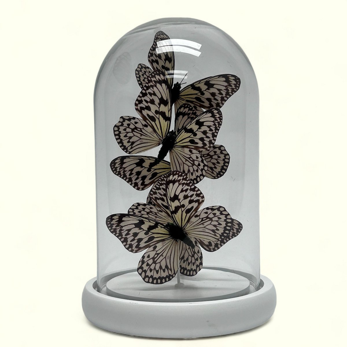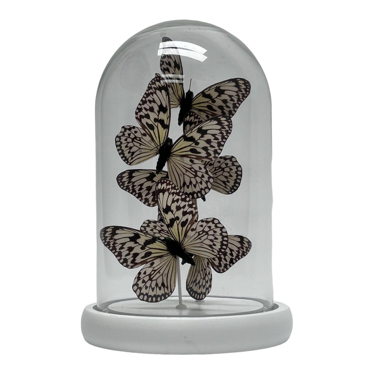 Breng de sereniteit van de natuur in huis met onze elegante glazen stolp met vijf zorgvuldig nagemaakte vlinders van het soort Idea leuconoe obscura, ethisch verfijnde zijde voor een levensechte weergave. Volledig met de hand gemaakt en ingewikkeld in ontwerp, dit stijlvolle item is de perfecte aanvulling voor elk type interieurdecoratie.